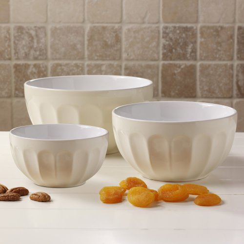 Just like granny used our cream vintage style mixing bowls with fluted sides are perfect for mixing cakes pancake batter whisking egg whites or for combining any number of recipe ingredients for all your culinary creations! Supplied as a nesting set of three they are sized 18cm diameter (1.2L small) 21.5cm diameter (2L medium) and a generous 25cm diameter (3.4L large). Dishwasher safe.