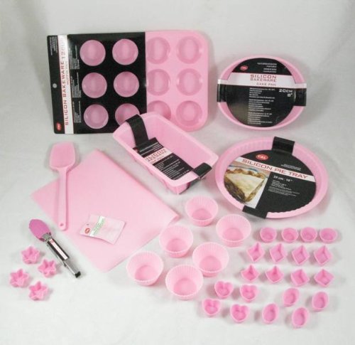 Silicone Bakeware Set 37pcs - Pink (Loaf Pan, Round Pan, Round Pie / Flan Dish, Baking Mat, Stainless Steel Tong with Silicone Head, Mixing Spoon, Muffin Pan 12 Cups, Chocolate Moulds, Muffin Cup Cake Bases)