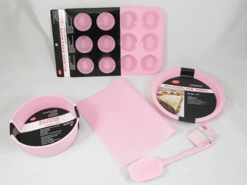 Silicone Bakeware Set 5pcs - Pink (12-Cup Muffin Pan, Round Pan, Round Pie / Flan Dish, Mixing Spoon, Baking Mat)