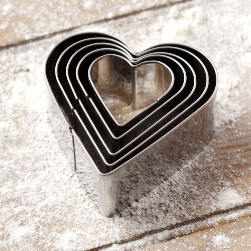 Perfect for Valentines Day anniversaries parties or to pop a special cookie in your loved ones lunch box our set of 5 graduating heart cutters are crafted from durable stainless steel and are supplied as a set in a storage tin for safe keeping. Suitable for dishwasher use. Smallest 4cm largest 8cm.